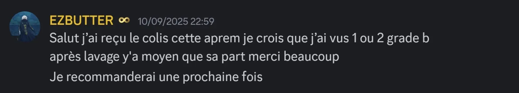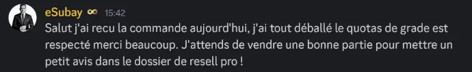 " Très carré, arrivé rapidement, contact facile, en grade B : -20%, j’ai déjà vendu la moitié, je me fait pas de souci pour un x2 peut être x3. Je recommanderai c’est sûr, une très bonne expérience. "